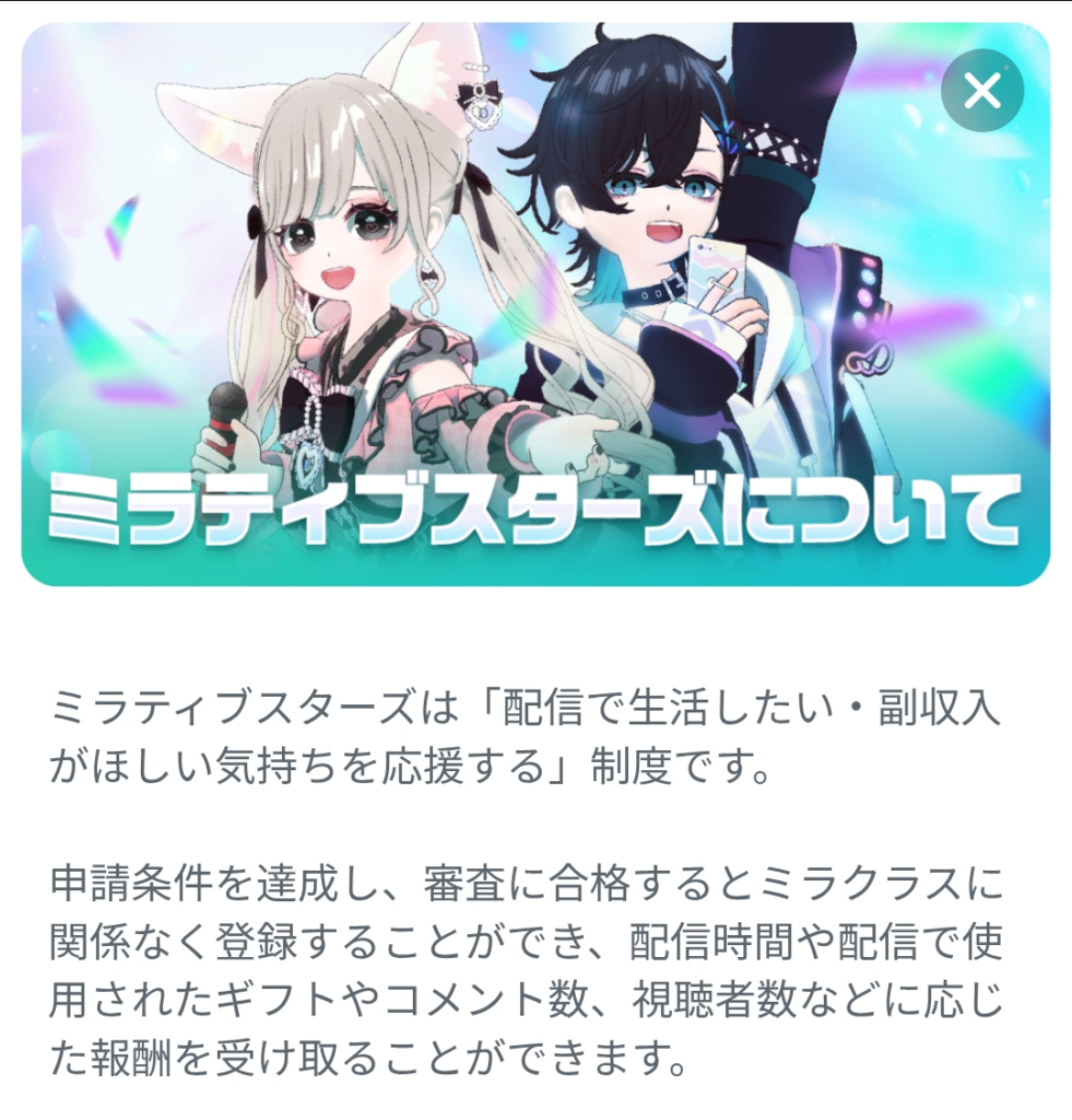 ミラティブスターズは収益化可能となったミラティブの配信者です