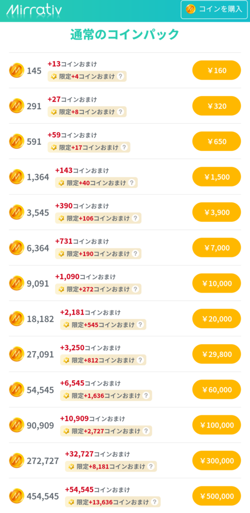 実は、ミラティブのコイン購入をWeb版(ブラウザ)から行うと、アプリ内課金に比べて無償コインがより多く手に入る設定になっています。